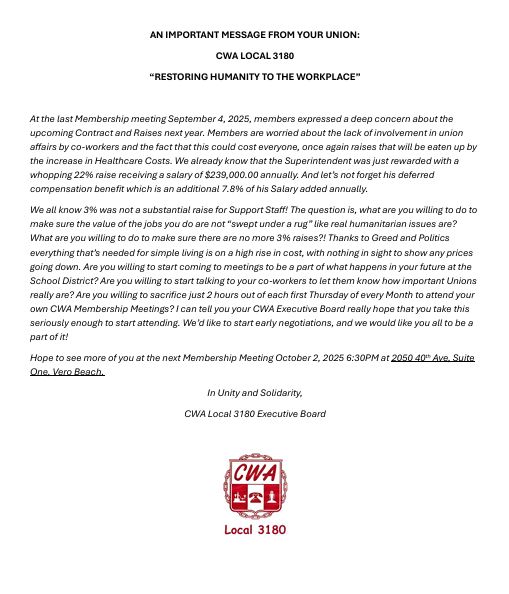 The CWA Local 3180 Bargaining Unit are blue and white collar employees including teacher assistants, secretaries, cafeteria workers, maintenance workers, custodians, school bus drivers, bus assistants, media and computer lab assistants, and clerks who want fair and equitable treatment by the School District of Indian River County.